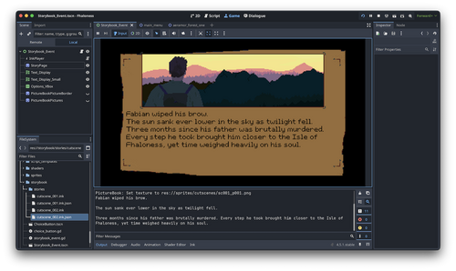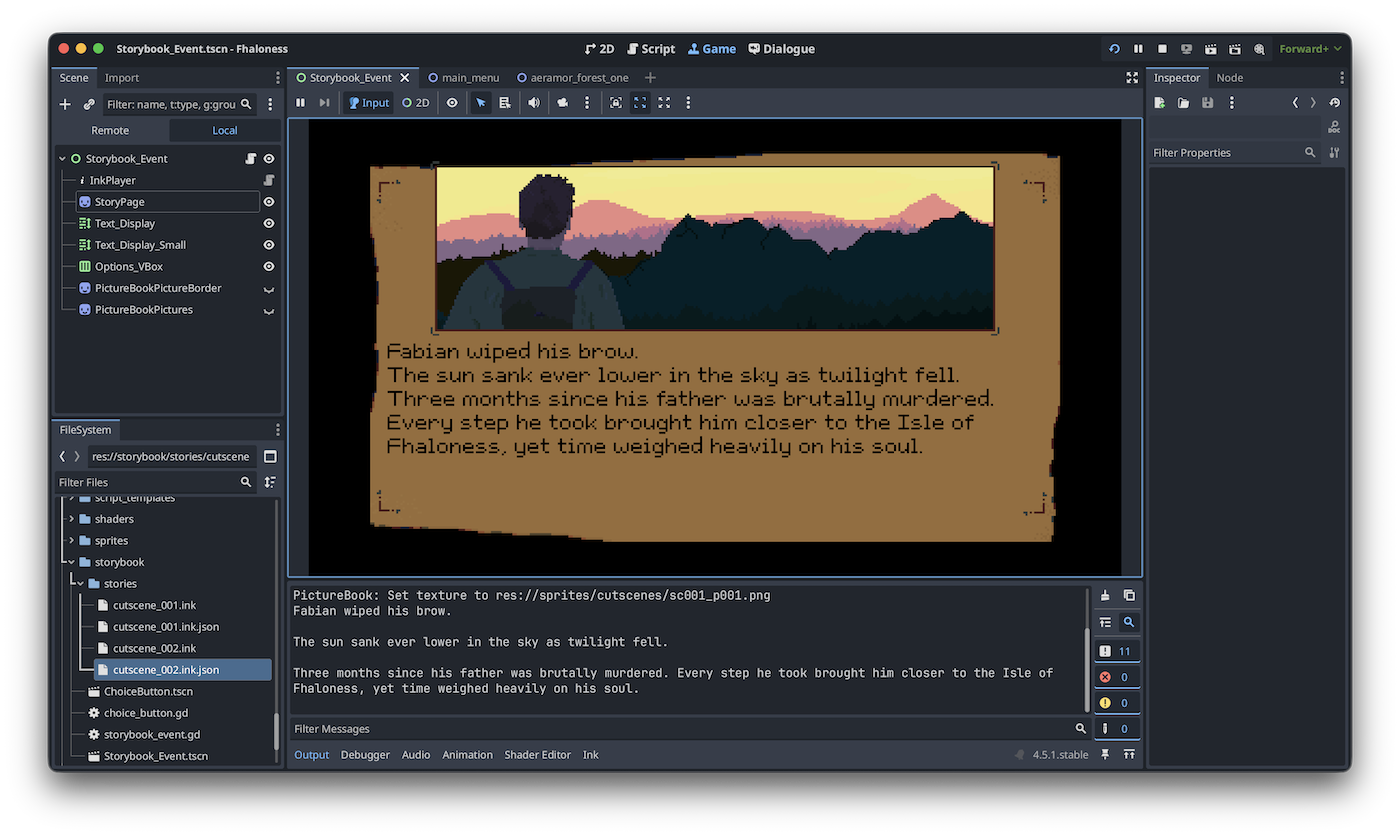 I’m aiming to use a similar cost-effective tool for certain cutscenes and brief interactions in Fhaloness. I’d previously coded this manually. I’d stumbled across Inky and Ink (https://www.inklestudios.com/ink/) a while back and it got me thinking. I’ve been aware of Inkle’s tools for a while, but had never considered integrating them into Godot or Fhaloness.